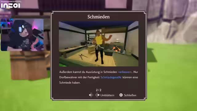 05:04:04Nach der erfolgreichen Platzierung der Schmiede wird der neue Schmiedegeselle mit seiner Rolle vertraut gemacht. Die Schmiede dient nicht nur zur Herstellung von Waffen und Rüstungen, sondern auch zum Verbessern bestehender Ausrüstung. Es werden verschiedene Waffentypen vorgestellt, wie z.B. das Langschwort mit seinem großen Angriffsradius, wobei der Streamer sich zunächst für den bereits geliebten Kurzschwert und Bogen entscheidet. Die Organisation des Inventars wird als wichtig für die Bewohnerarbeit angesehen.