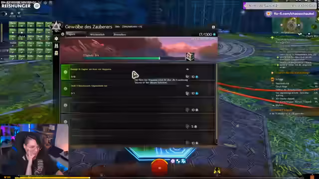 00:59:05Die Schwierigkeiten bei der Durchführung von FF14 Streams werden erläutert, da die Partnerin Sora privat sehr beschäftigt ist und die Streamerin abends oft erschöpft ist, was Abendstreams unmöglich macht. Es wird das neue Guild Wars 2 Addon 'Visions of Eternity' vorgestellt, das neue Spezialisierungen bietet. Die Streamerin hat sich für den Magier entschieden, dessen Spezialisierung ihr gut gefällt. Die Suche nach einem Schweberochen-Jungtier in Not, das nordwestlich vom Morgenrot-Bug gesichtet wurde, wird fortgesetzt, wobei die genaue Position schwer zu finden ist und die Streamerin immer wieder in Kämpfe verwickelt wird.