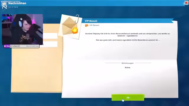 04:48:56Es wird festgestellt, dass das Museum im Minus ist, und es wird nach Wegen gesucht, um in den Plusbereich zu gelangen. Die Preise werden überprüft und als fair bewertet. Der Souvenir-Shop wird als gut besucht identifiziert. Es wird versucht, einen besseren Staubsauger zu bekommen, um die Sauberkeit im Museum zu verbessern. Es wird eine Geschichte über einen verlorenen Patenschein erzählt, um zu zeigen, dass Fehler menschlich sind. Trotz anfänglicher Schwierigkeiten wird der blaue Staubsauger gefunden und analysiert, was zu einer Wissensstufe führt. Es wird erwähnt, dass epische Gegenstände viele Besucher anziehen, aber das Museum noch nicht so weit ist. Es wird versucht, das Bett im Museum aufzuwerten und in den grünen Bereich zu gelangen. Ein VIP-Besuch für den nächsten Stern wird angekündigt. Der Lieblings-Stream-Kompane Sora D-Race wird vermisst, der möglicherweise der Männergrippe zum Opfer gefallen ist.