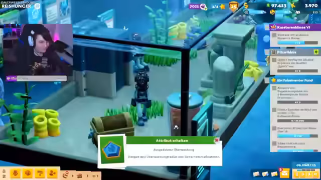 05:41:53Das Wissenschaftsmuseum wird als nicht besonders interessant empfunden, obwohl die Dekoartikel und die Möglichkeit, durch Exponate Mitarbeiter zu sparen, positiv hervorgehoben werden. Es gibt interaktive Exponate und Infotafeln. Im Gegensatz dazu freut sich die Streamerin auf das Unterwassermuseum, in dem Aquarien gebaut und verschiedene Fischarten gehalten werden können. Es wird betont, wie wichtig es ist, erfahrene Mitarbeiter für die gefährlichen Elektrofische einzusetzen. Das Unterwassermuseum ist ein Highlight, da es riesig ist und von den Leuten geliebt wird. Die Dekoration macht Spaß, und die Mitarbeiter tragen Taucheranzüge. Es gibt die Möglichkeit, Fische zu züchten und ihre Seltenheitsstufe zu erhöhen, was Zeit und Arbeitsstunden spart. Das Unterwassermuseum ermöglicht es, mit Farben zu spielen und hübsch zu dekorieren. Die Streamerin ist gespannt darauf, welche Fischarten sie noch entdecken wird, darunter Seesterne mit Sonnenbrillen und Schildkröten mit aufgeschnürten Panzern.