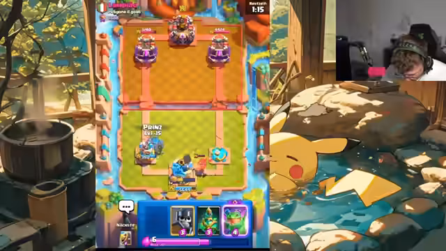 Ein League of Legends-Spiel wird durch Grafikkartenprobleme und frühe Schwierigkeiten beeinträchtigt. Der Spieler äußert Frustration über sein Team und das Matchmaking. Anschließend steigert sich der Ärger in Tiraden über Clash Royale, insbesondere über Goblin Giant und unfaire Matchups. Technische Probleme mit OBS kommen hinzu. Zum Schluss kündigt der Spieler das Ende an.