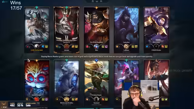 11:08:01Zu Beginn des Stream-Ausschnitts konzentrieren sich die Spieler auf das Gameplay, besonders auf die Interaktion zwischen den Champions. Es gibt Diskussionen über Fähigkeiten, Item-Builds und strategische Ziele wie den Baron. Die Streamer zeigen sich begeistert von erfolgreichen Combos und äußern Frustration über Fehlschläge. Die Kommunikation zwischen den Teammitgliedern ist intensiv, mit häufigen Anweisungen und taktischen Ratschlägen.