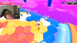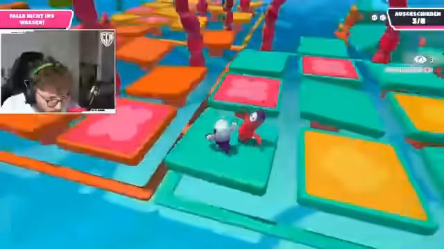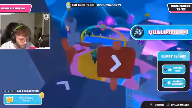 04:24:55Im allerletzten Versuch, das Spiel doch noch zu einem Erfolg zu machen, versucht der Streamer, seinem Mitspieler Kuba zur Ziellinie zu verhelfen. Da Kuba offenbar den Überblick verloren hat und sich im Kreismoves verheddert, gibt der Streamer laute und unpräzise Anweisungen durch den Chat. Er fordert ihn auf, sich auf das blaue oder rote Ziel zu orientieren, während die Situation durch Hindernisse erschwert wird. Die Szenarien zeigt die enorme Frustration und den Druck des Wettbewerbs bis zum letzten Moment.