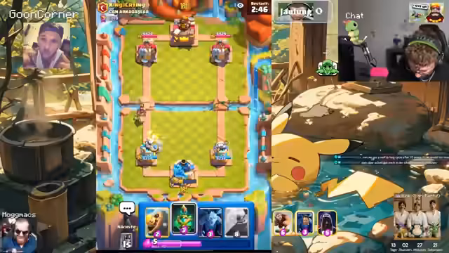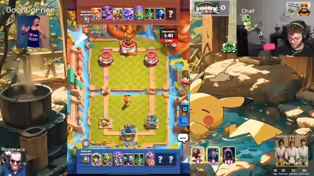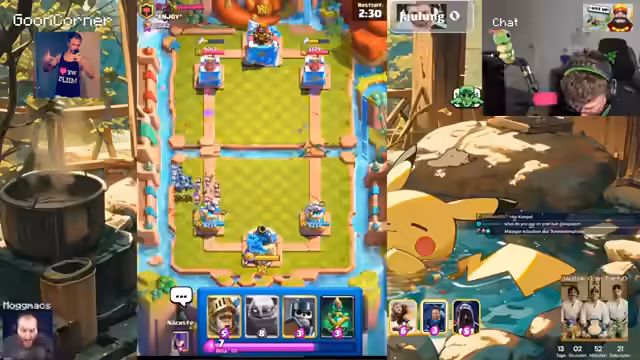 01:39:27Zwischen Minute 99 und 113 finden intensive Clash Royale-Matches statt, bei denen Strategien wie das Platzieren von Einheiten (Babydragon, Prinz, Hexe, Golem) und der Einsatz von Zaubern (Barbell, Ranken, Waffel) im Vordergrund stehen. Es werden Taktiken für Same-Lane-Races gegen Golems und der defensive Einsatz von Einheiten diskutiert. Der Fokus liegt auf dem Konter von gegnerischen Angriffen und dem effektiven Nutzen von Elixier, um Vorteile zu erlangen. Es werden verschiedene Spielzüge analysiert, darunter der Einsatz von Bubble und Drins gegen eine Hexe, sowie der strategische Einsatz von Minions und Baby Dragons. Es wird die Bedeutung von schnellen Reaktionen und das Ausnutzen von Fehlern des Gegners betont, um Türme zu verteidigen und Kronen zu gewinnen. Auch der Spaß kommt nicht zu kurz, als der Streamer sich versehentlich verklickt und humorvoll darauf reagiert. Es werden Überlegungen angestellt, ob bestimmte Karten wie der Mini-P.E.K.K.A. gemaxed werden sollen und wann der richtige Zeitpunkt für einen Golem-Push ist, um den Gegner zu überrennen. Es wird auch auf die Bedeutung der Defensive und das Antizipieren von gegnerischen Zügen hingewiesen. Die Zuschauer werden aktiv in die Entscheidungsfindung einbezogen, indem der Streamer nach ihrer Meinung fragt und ihre Vorschläge berücksichtigt.