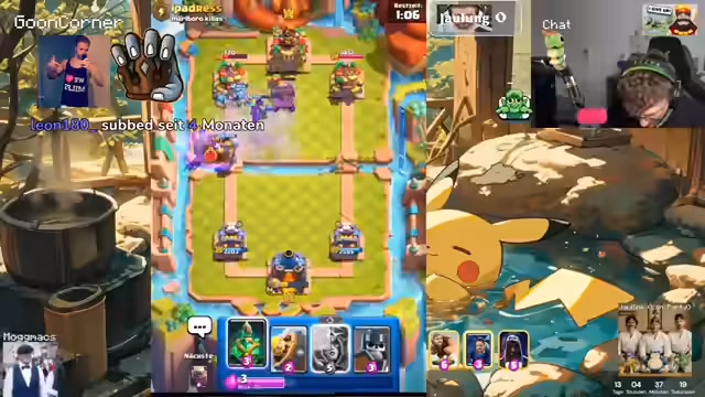 01:42:50Ab Minute 102 wird über spezielle Skins und veränderte Spielmechaniken in Clash Royale diskutiert, insbesondere im Zusammenhang mit chinesischen Servern. Dort werden rote Flüssigkeiten und Skelette zensiert, was zu veränderten Darstellungen von Einheiten wie Guards und Skeletten führt. Der Streamer äußert sich amüsiert über die Vorstellung, dass es solche Anpassungen gibt und fragt sich, ob diese auch in Deutschland oder Europa eingeführt werden könnten. Es wird auch über den BMI-Mode gesprochen, der ursprünglich zur Unterstützung gedacht war, aber nun oft für BM-Emotes verwendet wird. Der Streamer erwähnt kurz ein Placement, das er erhalten hat, und geht dann wieder auf das Spiel ein. Es wird überlegt, welche Einheiten defensiv eingesetzt werden sollen und wie man am besten auf die Züge des Gegners reagiert. Der Fokus liegt darauf, das Spielgeschehen zu analysieren und die richtigen Entscheidungen zu treffen, um den Vorteil zu behalten. Es wird auch die Bedeutung von Teamwork und Kommunikation hervorgehoben, um gemeinsam Strategien zu entwickeln und erfolgreich zu sein.