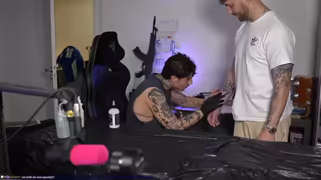 05:43:02Der Streamer spricht über einen Follower mit einem ähnlichen Namen und scherzt über Undercover-Streams. Er trägt Gedichte vor, darunter John Maynard und Der Erlkönig, und improvisiert ein eigenes Gedicht für den Chat. Es wird über Valorant gesprochen und ein 3D-Druck eines Valorant-Gegenstands gezeigt, der von einem Zuschauer angefertigt wurde. Der Streamer gibt Tipps für YouTube-Links in Insta-Storys und erklärt, wie man die YouTube-App direkt öffnen kann. Es folgt eine Diskussion über die verwendete Tinte beim Tätowieren, Pantara, und die Bedeutung der richtigen Farbmischung für verschiedene Hauttypen. Der Tätowierer bereitet den Arbeitsbereich vor, und es werden verschiedene Kameraeinstellungen ausprobiert, um den besten Blick auf das Tattoo zu ermöglichen. Der Streamer fragt den Chat, ob er auf die Piste geht, da es Freitagabend ist. Abschließend wird die begrenzte Platzsituation im Studio und die Notwendigkeit, den Tätowierer nicht einzuschränken, thematisiert.