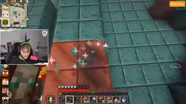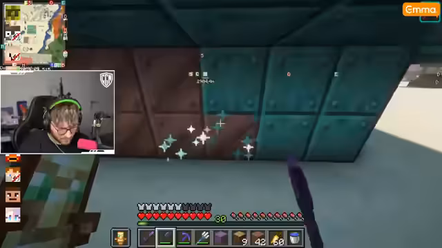 07:50:33Der Stream konzentriert sich intensiv auf das gemeinschaftliche Abbauen von oxidierten Kupferblöcken für ein Charity-Event. Die Teilnehmer kämpfen um jeden Block, wobei taktische Spots gesichert werden müssen, um effizienter abzubauen. Es wird die Organisation des Teams diskutiert, und da ein Mitglied, Paul, nicht anwesend ist, wird ihm symbolisch der letzte Block des Golems für den späteren Baufortschritt zugesichert.