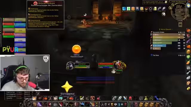 04:20:34Die Gruppe trifft auf einen Trash-Boss, einen großen Hund, der gefährliche Fähigkeiten hat. Der Streamer warnt vor einem Terrafang-Raw, der die Gruppe fliegt und Fallschaden verursachen kann. Der Boss kann auch einen Aggro-Reset auf zufällige Spieler auslösen und feuert um sich herum. Die Tanks, Chazy und der Streamer, sind immun gegen diese Angriffe, aber die Healer müssen aufmerksam sein. Der Kampf beginnt, indem ein Pet den Boss anlockt und der Tank ihn positioniert. Der Streamer verwendet Berserk, muss sich aber gegen den erhöhten Schilde heilen lassen. Es kommt zu einem chaotischen Moment, in dem sein Leben bedroht ist, aber sein Team rettet ihn, indem ihm ein Schild gegeben wird.