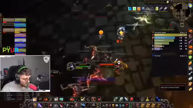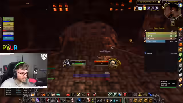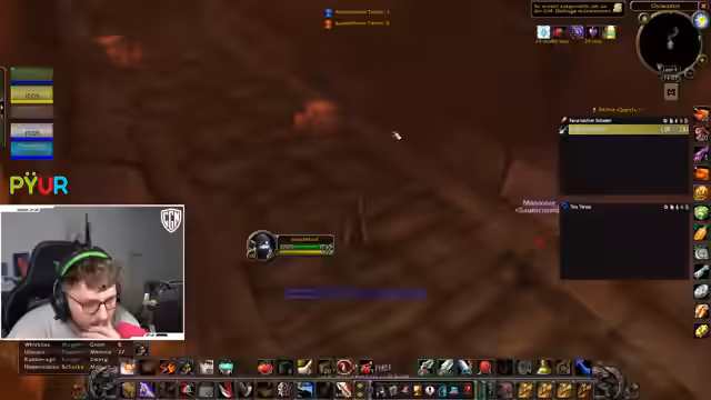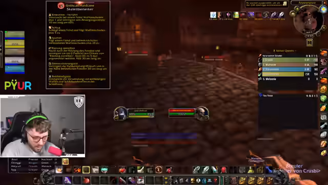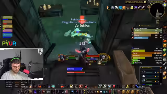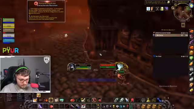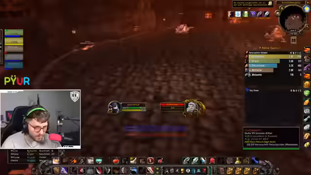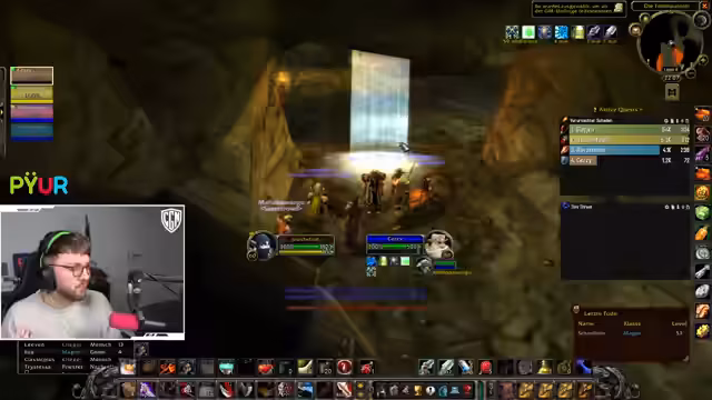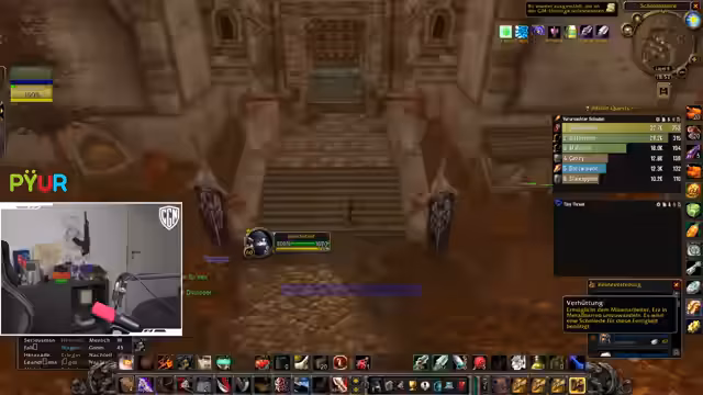 00:53:59Bei einem Pull wird versehentlich eine große Gruppe von Mobs, inklusive einer 'Putt' (einer gefährlichen Elite), angezogen, was sofort zur vollen Agro führt und die Gruppe in lebensbedrohliche Situationen bringt. Chefstrozel reagiert sofort, indem er den ersten 'Dummy' (ein Fluchobjekt) nutzt, um einen Teil der Mobs auf sich zu ziehen, während die restliche Gruppe flieht. Er kommandiert den Rückzug nach oben aus dem Dungeon, um der Übermacht zu entkommen und einen totalen Wipe zu verhindern.