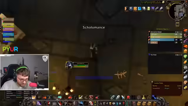 04:56:00Der Streamer plant, nach dem aktuellen Spielbereich einen neuen Ort, Scholomance (kurz Scholo), zu besuchen. Er benötigt jedoch einen spezifischen Magier für die Gruppe, da die derzeitigen Mages nicht verfügbar sind. Die Suche nach einem Ersatz ist daher die Priorität, und der Streamer bittet seine Zuschauer um Hilfe, einen freien Magier zu finden. Gleichzeitig wird die Zusammensetzung der Gruppe für ein mögliches BRD (Blackrock Depths) Run besprochen, bei dem Tanks und Damage Dealer benötigt werden.