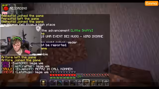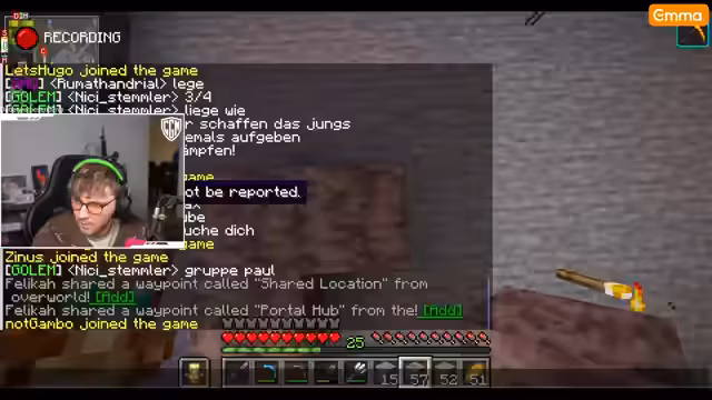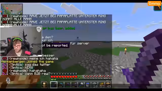 02:45:31Die Spieler konzentrieren sich auf das Management ihrer Villager, insbesondere der "Fortune"- und "Mending"-Villager, die in Kammern untergebracht werden sollen. Es wird diskutiert, ob es notwendig ist, überall Karottentrader zu platzieren, und man kommt zu dem Schluss, dass vier bis fünf ausreichen sollten. Hugo kommt hinzu und äußert seinen Frust über eine kalte Pizza Margarita, die er bestellt hat. Er ist enttäuscht, da er sich den ganzen Tag darauf gefreut hat. Die anderen Spieler reagieren mit Humor und Spott auf seine Beschwerde. Die Diskussion wechselt zu Musikgeschmack, wobei Hugo Techno ablehnt und lieber Songs hören möchte, bei denen man mitsingen kann, wie "Last Friday Night" von Katy Perry. Er kündigt ein "Mini-Event" in etwa einer Stunde an, ein Musical, was von den anderen Spielern belächelt und als "kleine Attraktion" abgetan wird, da es kein echtes Event sei, nur weil man ins Mikrofon schreit und Disney-Songs singt.