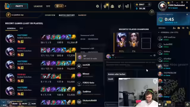 Chefstrobel berichtet über ein Cosplay aus China und bittet um Bewertung seiner Insta-Story. Er sucht nach IRL-Streaming-Ideen für Hamburg, kündigt Brillen-Merchandise an und äußert seinen Frust über Beleidigungen und Throwing in League und Valorant. Er teilt seine Elo-Erfahrungen und Dating-Präferenzen und analysiert ein verlorenes Spiel mit Verdacht auf Account-Kauf.