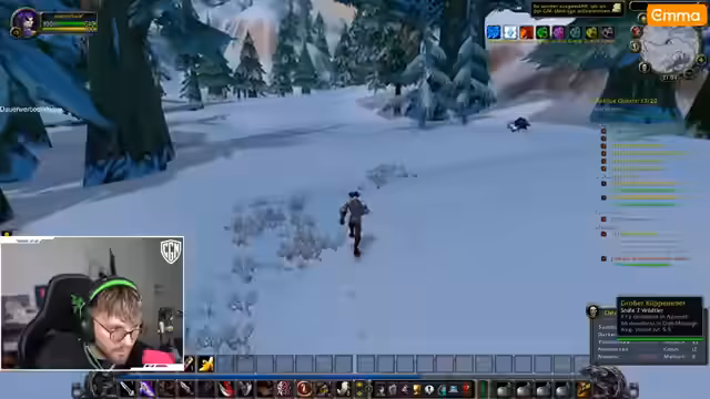 00:00:57Der Stream beginnt mit einem Begrüßung des Chats. Der Streamer berichtet, dass er seine WoW-Aktivitäten weiter ausbauen möchte und erwähnt, dass Hanna öfter bei seinen WoW-Sessions als bei Valorant anwesend ist. Er erzählt von seinen ersten Quests in der Welt und teilt mit, dass er gestern erst angefangen hat (First Time) und zweimal fast gestorben ist. Er sammelt aktuell Zähne von Rehen und beschwert sich über den spärlichen Spawn der benötigten Säbelzahntiger im Verhältnis zu den vielen Bären.