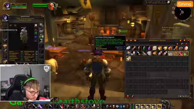 07:06:31Der Streamer optimiert seine Ausrüstung: Er verkauft unnötige Items (z.B. Wolfsstoff, überflüssiges Essen) und craftet Lederrüstungen. Ein Zuschauer gibt ihm Taschen als Trainingsunterstützung, die er bewusst nur für Übung nutzt. Beim Crafting priorisiert er Effizienz – Kochen von Gewürzen, Erstellen von Sets – und analysiert Schadenswerte von Waffen. Er reflektiert über das Suchtpotential von WoW und die positive Community, die ihn trägt.