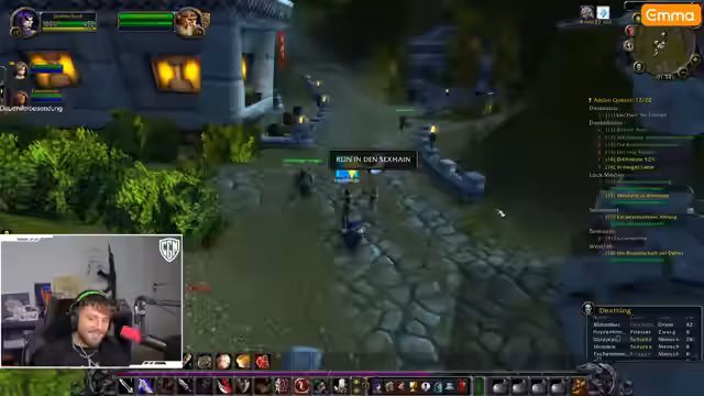 02:19:20In Sturmwind ist der Streamer von der Größe und Atmosphäre der Stadt beeindruckt und findet sie deutlich geiler als die Nachtelfenstadt. Er sucht nach seinem Waffenlehrer, um sein neues Schwert zu benutzen. Der Chat gibt ihm die Anweisung, zur Hogger-Quest zu gehen, eine legendäre Quest für Level-10-Spieler. Er nimmt die Quest an, zieht jedoch ungewollt mehrere Mobs an (Pullen) und wird von Mitspielern kritisiert, da dies gefährlich ist.