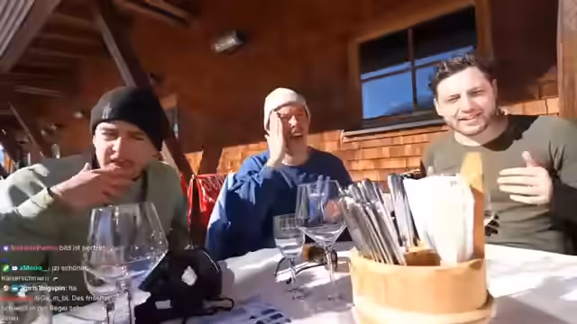 02:44:39Im angepeilten Restaurant angekommen, stellt die Gruppe fest, dass sie nicht direkt rein dürfen, da das Eis gefährlich sein könnte. Stattdessen wird ein Tisch im Gastraum reserviert. Während des Wartens auf das Essen und Getränke, wie mehrere Cola Zero, wird über das Wetter gesprochen, und jemand berichtet, dass er Sonnenbrand hat. Die Stimmung ist gelassen, während auf die Bestellung der Speisen gewartet wird.