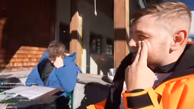 00:10:50Die Gruppe fährt mit der Gondel den Berg hinauf und ist von der Menschenmenge überrascht. In der ennen Kabine kommt es zu diversen Anekdoten und Gesprächen. Der Streamer interagiert stark mit dem Chat, liest Spendenaufrufe vor und sorgt für Stimmung. Max gibt sich mit seiner neuen Warnjacke sicher, während die Gondelfahrt als lang und ungemütlich beschrieben wird.