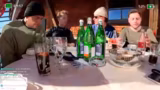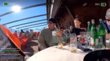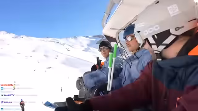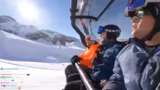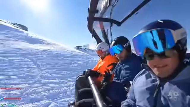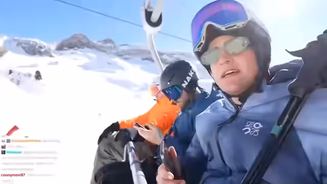 02:20:47Beim Anstehen für den Lift zur schwarzen Piste erstellt die Gruppe einen viralen TikTok-Trend, bei dem alle im Lift im Takt eines Songs mit dem Kopf nicken. Der Streamer ist dafür extra mobil geworden, während die restliche Gruppe sitzt. Im Anschluss daran fahren sie mit dem Lift hinauf und genießen die spektakuläre Aussicht und die Anspannung vor der Abfahrt. Sie filmen und kommentieren die Fahrt und planen, jeden auf der schwarzen Piste abzulichten.