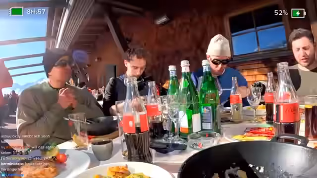 03:30:15Nach dem ausgiebigen Mittagessen wechselt die Location und die Stimmung. Man ist nun beim Curling und die Technik wird thematisiert. Die Teilnehmer versuchen, eine GoPro-Kamera zu testen und Bildprobleme zu lösen. Die Verbindung ist instabil, und man diskutiert, ob man mit dem Handy oder der GoPro weiter streamen soll. Die Gruppe bleibt trotz technischer Herausforderungen bei Laune.