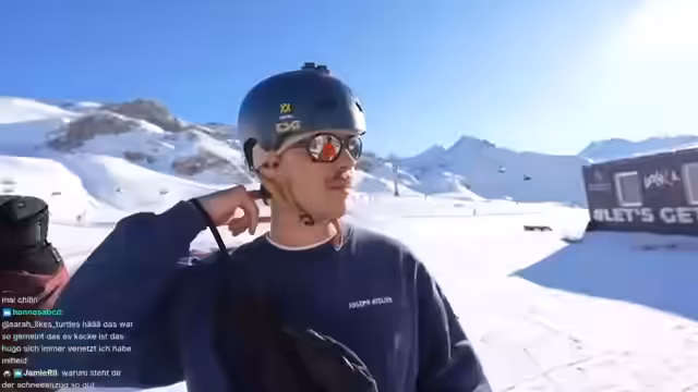04:11:48Es wird angekündigt, dass die Kamera und die Akkus gewechselt werden, bevor es losgeht. Während der kurzen Unterbrechung von etwa 20 Sekunden werden die Zuschauer um Geduld gebeten. Es wird die Schönheit der Eisblöcke hervorgehoben, die wie Diamanten aussehen. Ein kurzer thematischer Wechsel erfolgt zu einem Strand am Ballermann, bevor die Gletscherwanderung und die Helme thematisiert werden. Es wird festgestellt, dass Khil einen zu kleinen Helm bekommen hat, was für allgemeine Erheiterung sorgt. Nach einer kurzen Klärung, ob die Verbindung wiederhergestellt ist, wird die Rückkehr zum Skifahren angekündigt, zusammen mit dem Überraschungsgast Hugo, was die Vorfreude auf die bevorstehende Action steigert. Hugo plant, einen Frontflip auf dem Airbag mit seinem Snowboard zu versuchen, was die Spannung weiter erhöht.