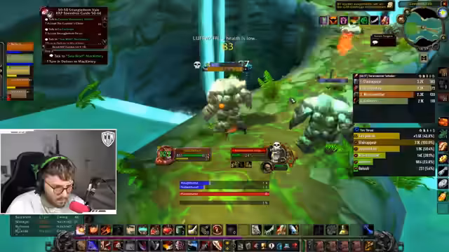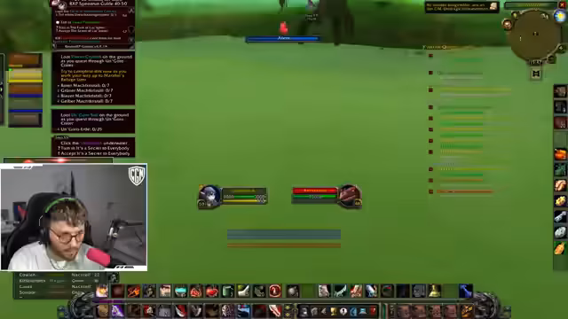 11:27:47Der Streamer erlebt einen kritischen Moment, als er aus Faulenzing versehentlich mehrere Mobs auf sich zieht und nur durch den Einsatz von Light of the Loom überlebt. Er analysiert den Fehler, bei dem er in Panik Katzensprint statt Reisegestalt nutzen wollte und von einem Slow-Effekt getroffen wurde. Der Verlust desCooldowns für Light of the Loom wird als große Gefahr für die Zukunft betrachtet, da er nun ohne diesen Sicherheitspolster im Rested XP-Gebiet auf Level 51 gegen Mobs des Levels 53 antreten muss.