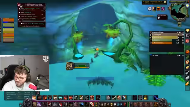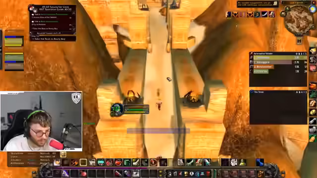 08:17:21Nachdem sich die Gruppe getrennt hat, erkundet der Streamer die Sengende Schlucht. Er hat Angst, da er das Gebiet noch nie besucht hat, ist aber neugierig auf die Elite-Quests. Er warnt davor, auf bestimmte Plattformen zu laufen, da man runterfallen könnte. Er entdeckt einen neutralen Horde-Flugpunkt und eine Startquest, die er annehmen möchte.