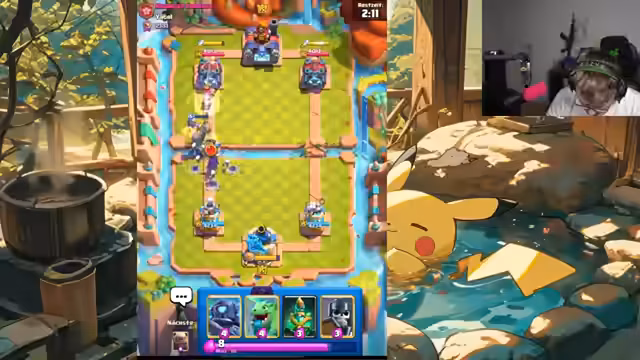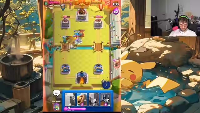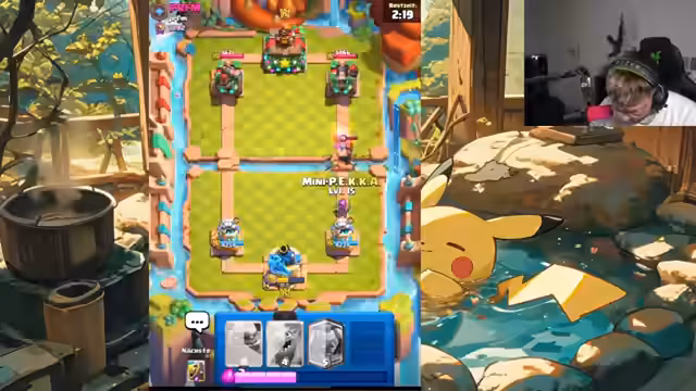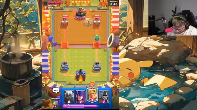 00:00:25Der Stream startet mit kleinen Konversationen und Diskussionen über Spieldecks. Der Streamer berichtet über Probleme mit seinem aktuellen Deck, welches ihm zu schwach erscheint, und gibt Einblicke in seine Spiele, in denen er gegen stark überlevelte Gegner kämpft. Er äußert Frustration über seine geringen Kartenlevel im Vergleich zu den Gegnern, die ihn am Weiterkommen hindern und zu mehreren Niederlagen führen. Dabei ist besonders das X-Bogen-Deck ein wiederkehrendes Thema.