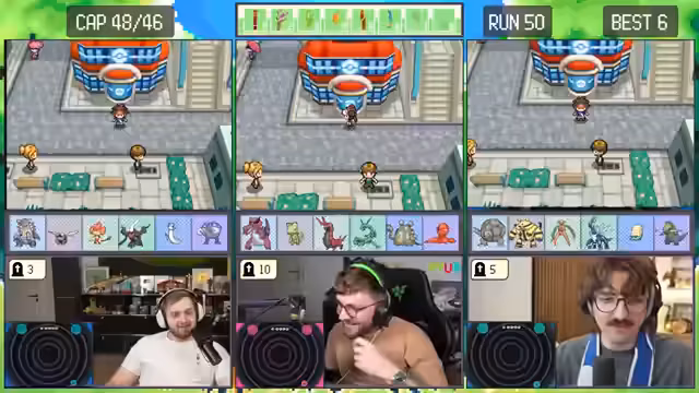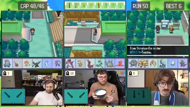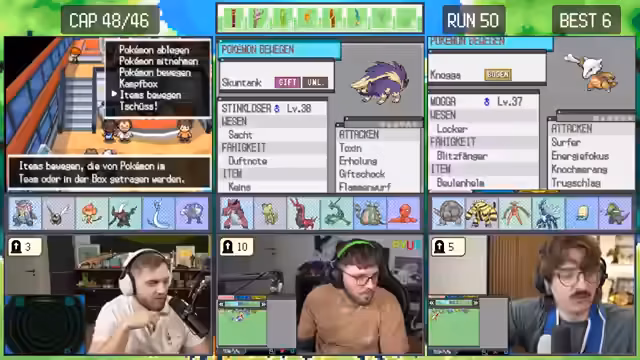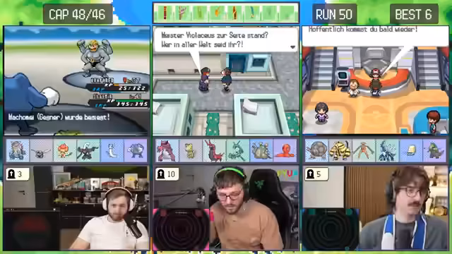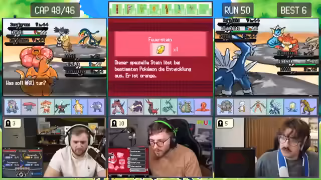 03:47:01Vor einem neuen Kampf müssen sich Streamer und Chat für einen Kampftyp entscheiden: links ein Reihumkampf oder rechts ein Dreierkampf. Der Streamer äußert starke Vorbeide gegen den Reihumkampf, der ihm als "Arschlecken" und zu zufällig erscheint. Stattdaten wirbt für einen Dreierkampf, bei dem alle eigenen Pokémon gleichzeitig angreifen können. Die Diskussion endet in einem Münzwurf, um die Entscheidung zu treffen, da der Streamer unsicher ist, welcher Modus der weniger riskante ist.