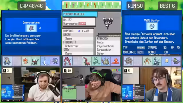 02:58:44Der Streamer analysiert sein aktuelles Pokémon-Team und seine Deckung von Schwächen. Er entscheidet sich, vier Pokémon mitzunehmen, darunter drei Bodentypen, obwohl er diese als "übertrieben scheiße" bezeichnet. Nachfragen im Chat bestätigen, dass das Team direkt nach dem Erreichen von Level 37 in die Arena auf Level 47 aufsteigt. Obwohl die Verluste in der Arena wahrscheinlich sind, betont der Streamer, dass er den Kampf für ein "Kammerbridge" auf sich nimmt, anstatt sich nur auf das persönliche Team zu konzentrieren.