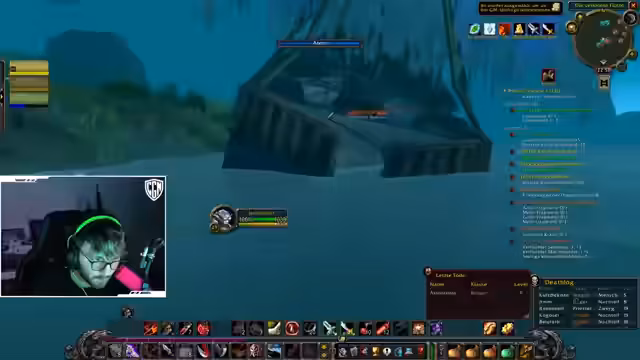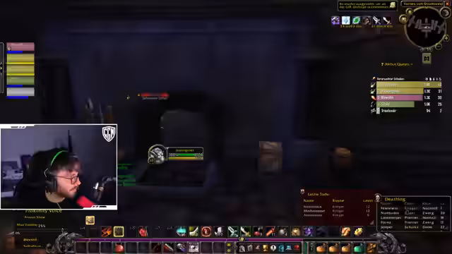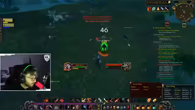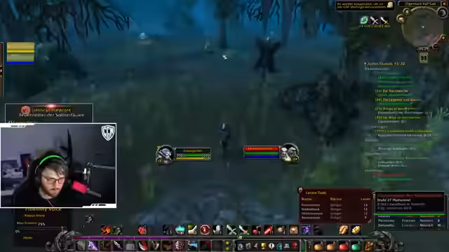 00:00:25Der Stream beginnt mit einem entspannten Gameplay-Ambiente, bei dem das Licht ausgeschaltet wird. Die Hauptsächliche Tätigkeit besteht im Questen in Sumpfland. Der Streamer stößt auf technische Probleme wie Layering, das ihn in andere Gruppen versetzt und den Spielablauf stört. Er startet eine Escort-Quest und bittet den Chat um Hilfe bei der Identifikation von Questgegenständen und Questzielen, was zu einer Diskussion über Questnamen und Abgabeorte führt. Das Ziel ist das Leveln und das Farmen von Beute.