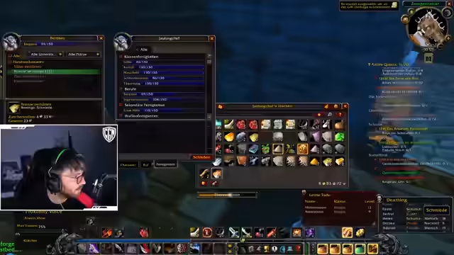 02:25:26Die Dungeon-Gruppe ist nun vollständig, und der Streamer bereitet sich darauf vor, mit Han, Tolkien und Ryrax Verlies zu betreten. Er wendet seine Aufmerksamkeit wieder dem Handwerk zu, indem er versucht, eine kleine Seidenentasche herzustellen. Dazu benötigt er Seidenstoff, was er durch das leveln seines Schneiderberufs zu erzeugen versucht. Er tauscht Ressourcen mit Gildenmitgliedern aus, um seine benötigten Materialien wie Kupfer und Leinenstoff zu beschaffen und für den bevorstehenden Dungeon gerüstet zu sein.