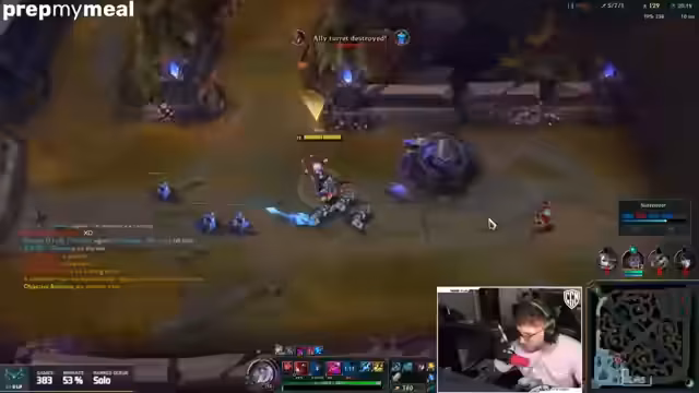 00:02:18Das Spiel startet und der Streamer kämpft gegen einen starken Gegner auf der Top-Lane. Er äußert sich frustriert über das Spielverhalten seiner Mitspieler, insbesondere eine Bot-Lane, die bereits früh viele Tode erleidet und als 'inting' bezeichnet wird. Der Streamer kritisiert, dass er in Emerald-Betriebsspielen häufig auf unzuverlässige Teammates trifft, was den Spieldrastisch reduziert.