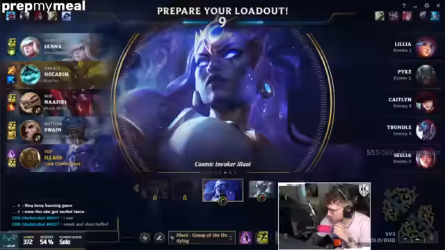 00:00:55Der Stream beginnt mit der Ankündigung des sechzehnten vierten Spiels. Der Streamer zeigt sich aktiv und beginnt direkt mit der Diskussion über Champion-Picks. Er erwähnt Polo Faker und Nasus Blood Moon als mögliche Picks und stellt fest, dass Yorick Dragon im aktuellen Patch gebufft wurde. Nach einer kurzen Unsicherheit über den ausgewählten Champion wird ein konkreter Plan gefasst, der das Spielen von Yorick oder Polo Fakemaker beinhaltet.