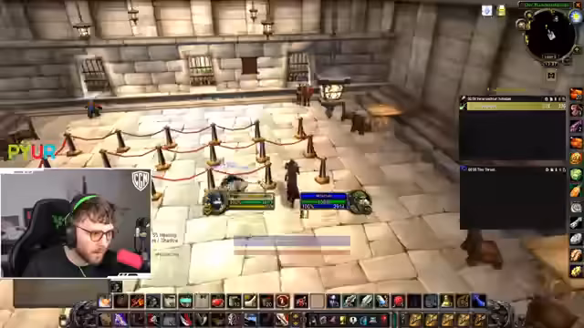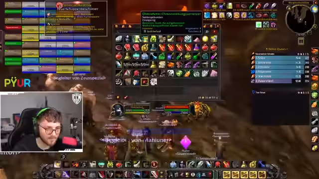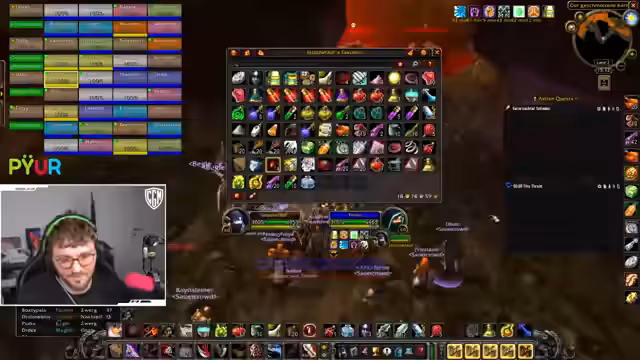 00:00:02Der Stream beginnt mit der Sorge des Streamers, in einer Rogue-Gruppe ohne Buffs platziert zu sein, obwohl er das beste Gear hat. Er versucht, Buff-Food wie Roids und Schokolade zu organisieren, stößt aber auf logistische Herausforderungen. Neben den Buff-Problemen kämpft er mit einem überfüllten Inventar und versucht, Platz für wichtige Gegenstände wie Wettsteine und Raketen zu schaffen, was zu chaotischen Interaktionen mit anderen Teilnehmern führt.