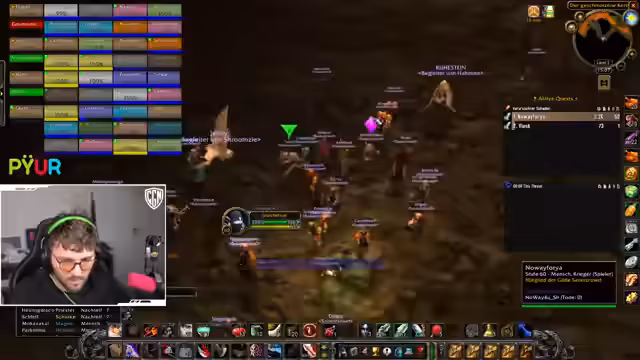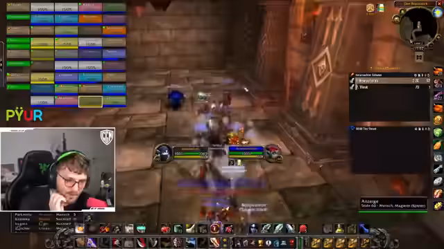01:28:22Der Streamer und sein Raid reiten gemeinsam los, wobei er sich über die beeindruckende Menge der Teilnehmer äußert. Er portet die Gruppe nach Blackrock Depths und bereitet sich auf den ersten Pull vor. Trotz anfänglicher organisatorischer Unruhe, die durch Romatras unabsichtlichen Trash-Pull verursacht wird, herrscht eine aufgeregte und euphorische Stimmung beim Betreten des Raid-Instances.