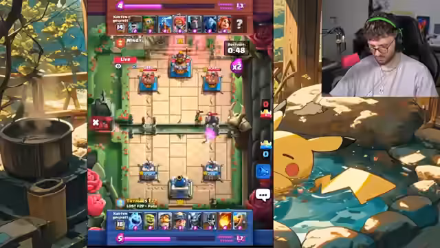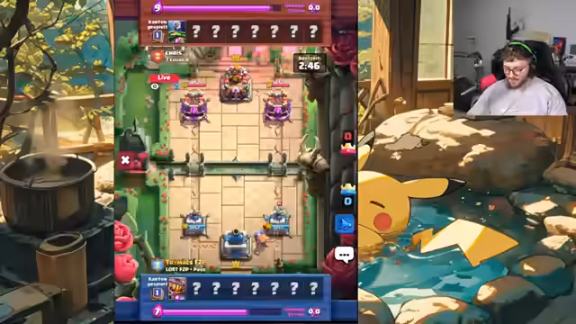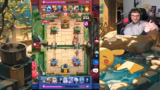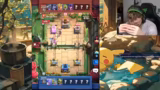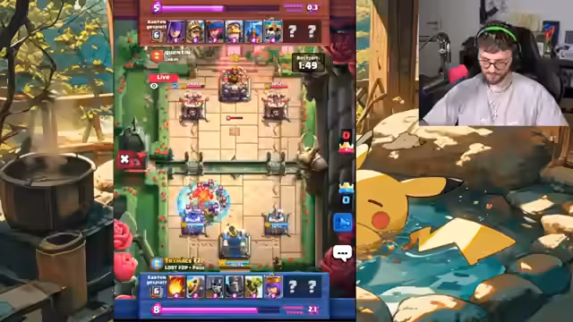 05:43:45Das Gameplay führt zu Verwirrung bei beiden Spielern. Der Gegner scheint nicht zu verstehen, wie man gegen das gespielte Deck vorgeht. Der Streamer äußert sich verwundert über die Spielzüge seines Gegners und stellt fest, dass dieser nicht optimal spielt. Er diskutiert über den Wert von Karten wie dem Runenriesen, den er als die schlechteste Karte im Spiel bezeichnet, da der Gegner dadurch Kronen bekommt.