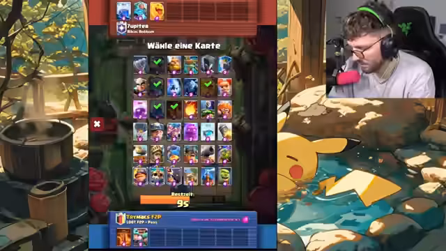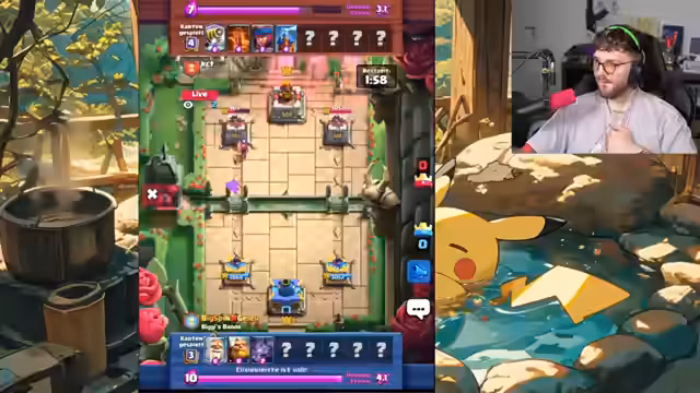 04:57:28Ein intensives Clash Royale-Turnier beginnt, bei dem der Streamer gegen TrySpin und Würzmacs antritt. Mit speziellen Regeln wie gemeinsamer Kartenwahl und großen Preisen im Fokus, wird die Strategie jedes Spielers genau analysiert. Die Spiele sind knapp, voller unerwarteter Picks und tragen zur allgemeinen Unterhaltung bei.