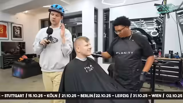 01:55:39Ein unerwarteter Wendepunkt ergibt sich, als beschlossen wird, Max' Bart komplett zu rasieren. Chef beschließt aus Solidarität und als kleine Bestrafung, ebenfalls eine radikale Haarveränderung vorzunehmen. Beide begeben sich zu einem Friseurladen in Hamburg, um sich die Haare blondieren zu lassen. Vor Ort erleben sie einen kurzen Zwischenfall, als Boris beinahe von einem Auto angefahren wird. Der Versuch, direkt vom Taxi aus weiter zu streamen, scheitert jedoch aus rechtlichen Gründen, weshalb der Stream im Laden fortgesetzt wird.