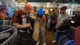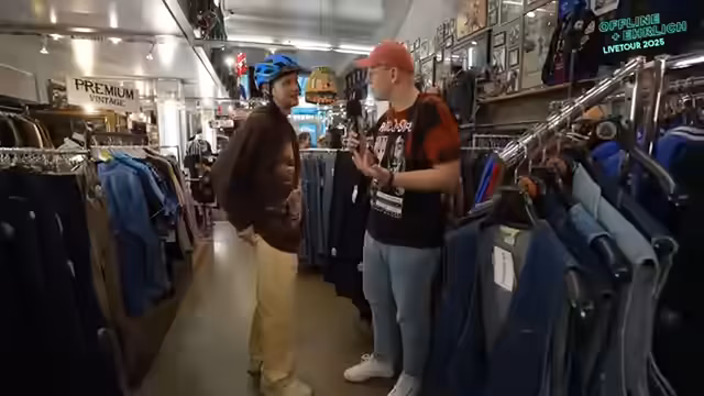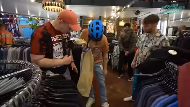 00:08:57Die Gruppe begibt sich in das große Sortiment des Ladens, das hauptsächlich aus Second-Hand-Kleidung aus den USA besteht. Sascha als modebewusstester der drei übernimmt die beratende Rolle. Das Ziel ist, für jedes der vier Streamer ein neues Outfit für die Tour zu finden. Das Shopping ist geprägt von der Auswahl und Anprobe verschiedlicher Kleidungsstücke wie College-Jacken, Sport-Trikots und Hemden. Dabei werden die Outfits auf der Bühne getestet und der Chat um die Meinung gebeten, obwohl die Streamer betonen, letztlich selbst zu entscheiden, was sie tragen werden.