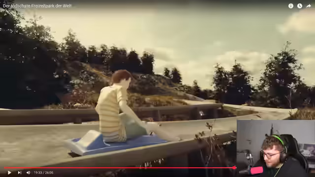02:43:01Nach einem Sieg in der Arena beendet der Streamer die aktuelle Spielsitzie und speichert den Spielstand. Der Fokus verlagert sich zu einer Unterhaltungseinlage, bei der ein Video über den berüchtigten Action Park in New Jersey gezeigt wird. Der Streamer kommentiert die im Video gezeigten extrem gefährlichen und unregulierten Attraktionen und dessen skrupellosem Betreiber, was zu faszinierten und schockierten Reaktionen im Chat führt.
