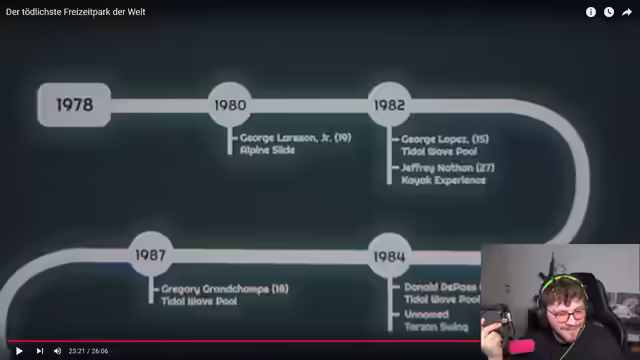 03:08:51Die Alpine Slide, eine 820 Meter lange Sommerrodelbahn, fordert mehr Verletzungen und Schadensersatzklagen als jedes andere Fahrgeschäft im Park. Die Schlitten haben zwei Geschwindigkeitsstufen, wobei die zweite als 'sicherer Tod' bezeichnet wird. Die Bahn besteht aus Asphalt, Asbest und Glasfaser, was zu Schürfwunden führt. 1980 stirbt der 19-jährige George Larsen, als er aus der Bahn fliegt und gegen einen Felsen prallt. Gene argumentiert, der Felsen sei schuld, nicht die Rodelbahn. Er behauptet, der Unfall sei nachts und bei Regen passiert, obwohl er sich während der Öffnungszeiten und bei trockenem Wetter ereignete. Der Fall kommt nie vor Gericht. Der Action Park zahlt der Familie in einem Vergleich 100.000 Dollar. Die Rodelbahn bleibt geöffnet. Die tödlichste Attraktion ist das Wellenbad, das mit bis zu 1000 Menschen gefüllt ist und starke Strömungen erzeugt. Sechs Menschen sterben im Actionpark: drei im Wellenbad, einer auf der Rodelbahn, einer am Tarzanseil und einer durch einen Stromschlag beim Kajakfahren.