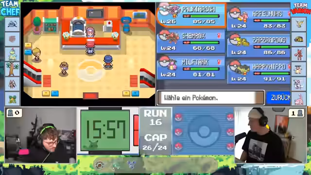 01:25:55Der Kampf gegen den Arenaleister beginnt. Der Streamer ist zunächst frustriert, da er glaubt, sein Pokémon könne dem Schaden nicht standhalten. Er wechselt jedoch strategisch Pokémon und nutzt Items wie "Trank", um den Kampf zu drehen. Obwohl er das finale Pokémon des Gegners mit "Eiszahn" besiegt, empfindet er den Kampf als "Scheiße" und "Wichse", da sich das Spiel unfair und zufällig angefühlt habe. Nach dem Sieg ist er erleichtert, muss aber sofort die Items in der Stadt einsammeln, bevor der nächste Kampf beginnt.