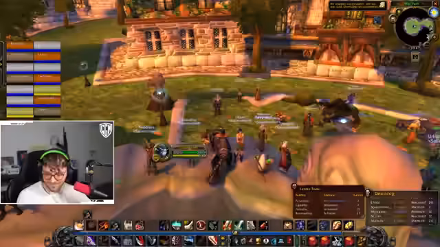 03:34:07Das Team farmt XP, indem sie Moorkrabler jagen, da die Quest dafür viel XP bringt. Sie bemerken, dass viele andere Spieler die gleiche Quest machen, was die Jagd erschwert. Es gibt einen World Buff um 18:58 Uhr, der für den Fortschritt wichtig ist, aber schwierig zu holen ist, da man dazu nach Stormwind fliegen muss. Der Buff gibt 15% auf alle Werte.