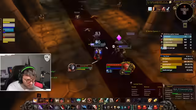 07:07:57Die Stream-Session beginnt mit der Koordination eines Dungeon-Runs, bei dem der Streamer mit seiner Gruppe Mobs in einem Raumclearen. Es gibt eine detaillierte Absprache über das Pull-Verhalten und die Zielvorgaben. Für den bevorstehenden Bossfight wird eine klare Strategie festgelegt: Zuerst wird der weibliche Boss getötet, danach wird der männliche Boss kampffähig, woraufhin beide gleichzeitig bekämpft werden müssen. Dies erfordert präzises Aggro-Management und die Koordination von Cooldowns, um die Bedronung zu kontrollieren und die Gruppe am Leben zu halten.