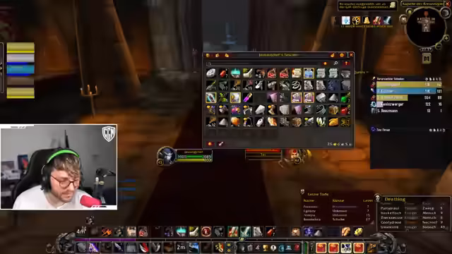 12:26:28Der Streamer und seine Gruppe betreten einen Dungeon, um Items zu looten und zu leveln. Es kommt zu interner Unruhe, weil ein Gruppenmitglied scheinbar gierig lootet, nicht den Anweisungen folgt und Aggro zieht, was den Kampf erschwert. Der Streamer agiert als Tank, versucht die Situation zu kontrollieren und bittet die Gruppe, Loot-Regeln einzuhalten, um Chaos zu vermeiden.