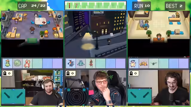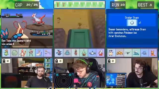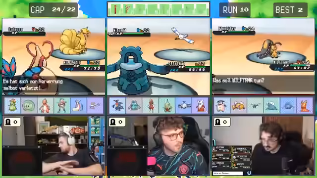 05:22:51Die Streamer beginnen einen Kampf gegen den ersten Trainer in der Pokémon-Runde. Sie haben mit Pokémon, die ungünstige Attacken und niedrige Level haben, zu kämpfen. Ein Pokémon stirbt schnell nach einem kritischen Treffer. Es kommt zu Diskussionen über die richtige Strategie, ob man stallen oder direkt angreifen soll, um Erfahrungspunkte zu erhalten und nicht den Run zu verderben.