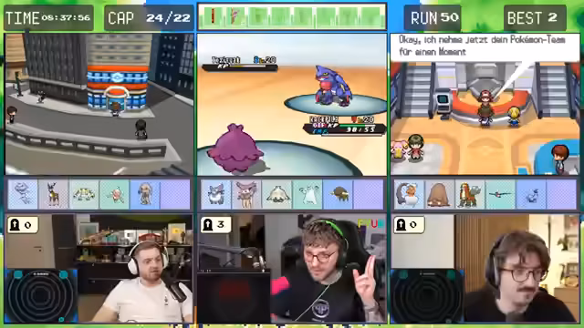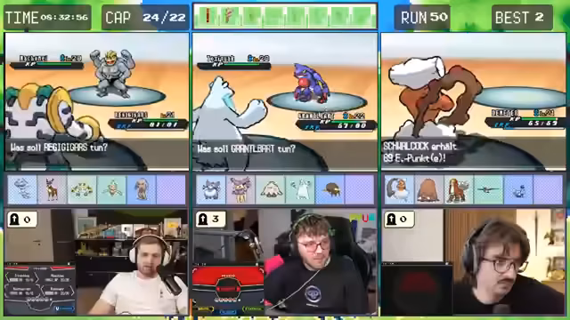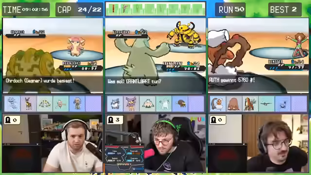 03:02:26Im Dungeon führen Kämpfe gegen Trainers und wilde Pokémon zu Verlusten. Die Streamer verlieren mehrere Pokémon, oft aufgrund von effektiven Attacken oder hohen Schadenswerten. Ein Kampf gegen einen Star-Trainer endet mit dem Verlust von drei Pokémon, was zu Frustration führt. Trotzdem wird an der Strategie festgehalten und man beschließt, weiterzumachen. Das Team muss neu bewertet werden, da mehrere Pokémon gefallen sind und man ungünstige Typ-Bezüge hat.