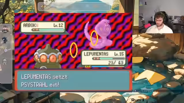 01:59:59Der Streamer startet den Kampf gegen den Arenaleiter Lulla mit nur zwei Tränken und geringer Lebensenergie. Er erkennt schnell, dass er einen Fehler macht und das falsche Pokémon einsetzt. Nachdem er den ersten Pokémon-Typen verloren hat, muss er seinen letzten Plan umsetzen und den Arenaleiter mit einem überlegenen Move besiegen, um den Kampf knapp für sich zu entscheiden.
