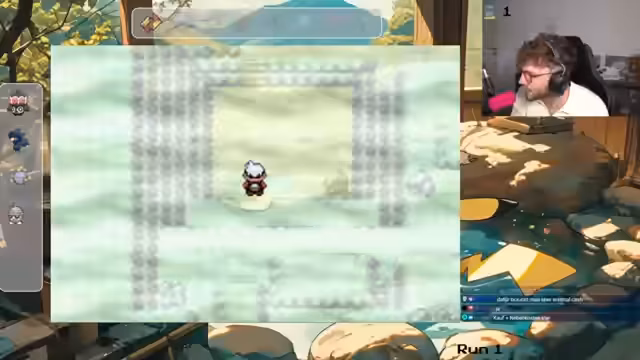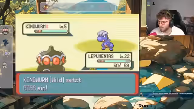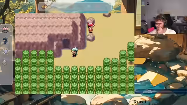 01:36:24Nach den persönlichen Gesprächen kehrt der Streamer zum Gameplay zurück. Er trifft auf seinen Vater in der Spielwelt und muss erneut einen wichtigen Brief übergeben. Dabei bemerkt er ein neues Encounter auf Route 104 und fängt ein Mirabla, dessen Typ (Pflanze/Gift) er zunächst falsch einschätzt. Er muss entscheiden, ob er das Pokémon tötet oder ob es ein rerolles Pokémon für den Run ist.