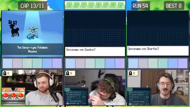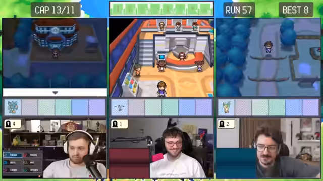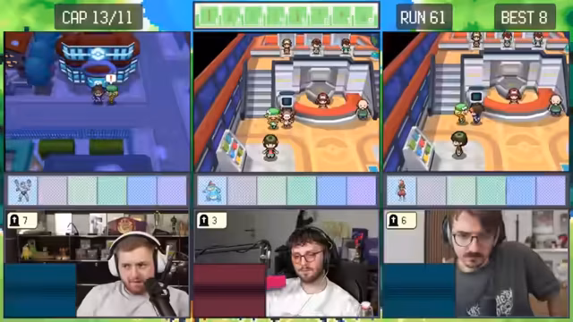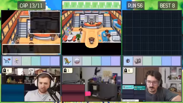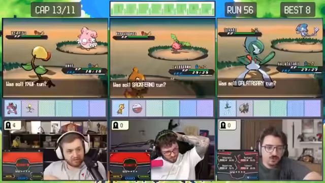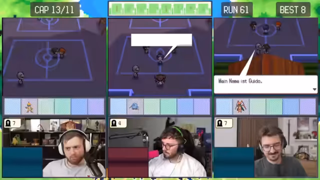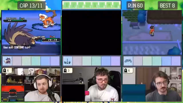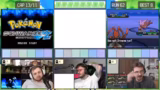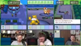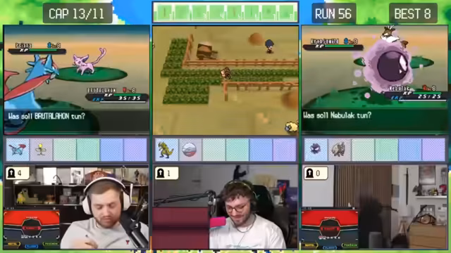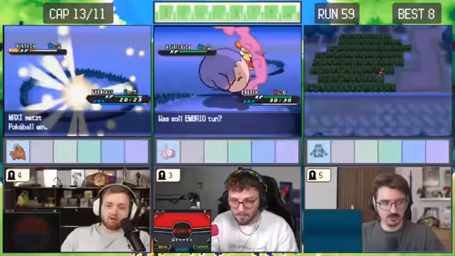 07:34:56Nach sechs Stunden schafft es das Team endlich, die Arena zu absolvieren. Sie haben nur noch ein Feuer-Pokémon pro Teammitglied. Es werden Entscheidungen über Items wie gehaltvolles Getränk getroffen. Das Team muss jetzt ein Wasser-Pokémon vermeiden, da alle nur noch Feuer-Pokémon im Team haben.